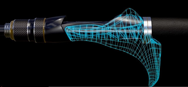 Vejam abaixo a ideia do criador da peça. Aquilo que se desenha em computador, e que depois é passado para peças reais, é trabalho de muitos meses ou anos, por parte de engenheiros especializados. O objectivo final é ter um punho fácil de segurar e menos cansativo. A maior parte de nós não nota sequer que tem o pulso angulado e por isso em tensão extra. Assumimos isso como sendo algo necessário, uma consequência do acto de pesca.